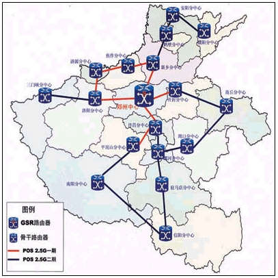 HERNET一期工程主干網(wǎng)采用IP POS技術(shù),應(yīng)用AVVID網(wǎng)絡(luò)體系結(jié)構(gòu),采用骨干傳輸網(wǎng)、城域網(wǎng)、接入網(wǎng)三層設(shè)計(jì)方案,以省網(wǎng)絡(luò)中心(設(shè)在鄭州大學(xué)網(wǎng)絡(luò)中心)、地市網(wǎng)絡(luò)中心、校園網(wǎng)三級(jí)管理模式。由省網(wǎng)絡(luò)中心向下以2.5G速度連接到各地市網(wǎng)絡(luò)中心,而向上則以155M速度連接到CERNET及Internet。整個(gè)一期工程實(shí)現(xiàn)了包括鄭州、許昌、平頂山、開封、洛陽、濟(jì)源、焦作以及新鄉(xiāng)等7個(gè)地市的2.5G連接,并形成了一個(gè)環(huán)網(wǎng)狀冗余拓?fù)浣Y(jié)構(gòu),確保當(dāng)網(wǎng)絡(luò)的一個(gè)節(jié)點(diǎn)出現(xiàn)問題時(shí),數(shù)據(jù)可以通過其他途徑傳輸?shù)侥康牡兀谝黄诠こ掏瓿珊,?0多所大學(xué)、中小學(xué)等教育與科研單位以千兆速度連接到HERNET上,共有近50萬的用戶能夠充分利用高速帶寬獲得教育網(wǎng)資源。