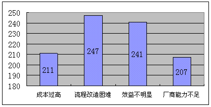 b)流程改造困難,對(duì)這個(gè)困難的擔(dān)心的企業(yè)數(shù)量最多,考慮到國(guó)內(nèi)企業(yè)的現(xiàn)實(shí)管理問題,流程改造必然與現(xiàn)實(shí)的利益發(fā)生矛盾,引起的阻力不可輕視。