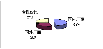 (5)向誰(shuí)購(gòu)買:鑒于國(guó)內(nèi)并沒有知名度很高的CRM實(shí)施廠商,而國(guó)外的著名廠商在國(guó)內(nèi)的品牌宣傳也不足,所以我們的調(diào)查表中只設(shè)了:國(guó)內(nèi)廠商、國(guó)外廠商和根據(jù)性價(jià)比進(jìn)行選擇三個(gè)項(xiàng)目,與購(gòu)買能力對(duì)照,預(yù)期實(shí)施金額在100萬(wàn)以下的企業(yè),一般側(cè)重國(guó)內(nèi)廠商,而實(shí)施金額在100萬(wàn)以上企業(yè)則側(cè)重國(guó)外企業(yè)。