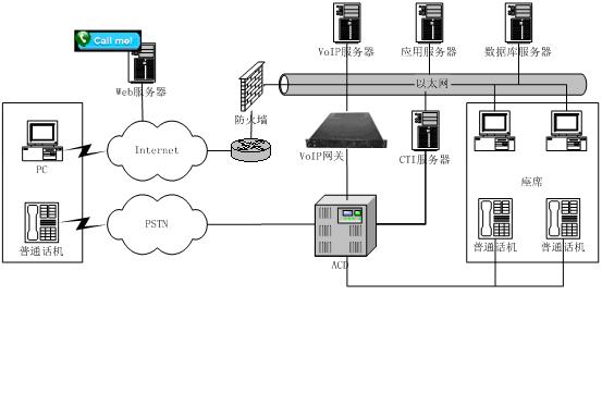 當客戶訪問企業(yè)網(wǎng)站,需要與企業(yè)客戶服務(wù)人員語音交流時,點擊“Call me”按鈕,如果客戶是第一次使用此功能,客戶終端會自動下載一個服務(wù)程序(對于Skype方式,會自動下載Skype軟件),并啟動服務(wù)窗口,用戶通過此窗口即可與呼叫中心進行交互,座席也將從服務(wù)器下載一個服務(wù)程序和用戶進行交互,并可通過互聯(lián)網(wǎng)實現(xiàn)遠程座席。