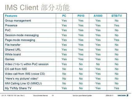 已經(jīng)實(shí)現(xiàn)的IMS業(yè)務(wù)有:組群管理,IPTV,IM即時(shí)消息,Push-to-talk POC,視頻會(huì)議,文件傳送,交互游戲,協(xié)同工作(白板應(yīng)用)等等