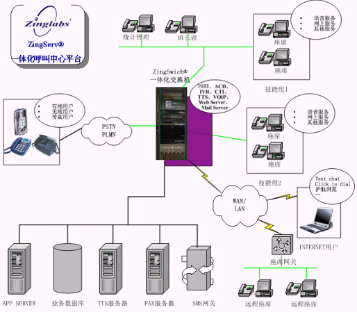 ZingServ®平臺的WEB呼叫/Chat 功能主要面向Internet用戶,用戶可通過Modem撥號、DDN專線、ISDN撥號、局域網(wǎng)、ADSL、Cable