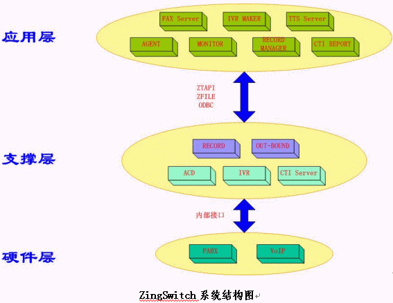 在以上三層結(jié)構(gòu)中,前兩層與具體業(yè)務(wù)系統(tǒng)無關(guān)。上層業(yè)務(wù)系統(tǒng)的多種變化,不會(huì)影響下層的穩(wěn)定;而下層規(guī)范地進(jìn)行優(yōu)化和擴(kuò)展后,上層的所有應(yīng)用都可在業(yè)務(wù)功能上得到擴(kuò)展。這樣,用戶的業(yè)務(wù)應(yīng)用系統(tǒng)自身可以有多種功能和性能的變動(dòng)和擴(kuò)展,同時(shí),當(dāng)基于ZingSwitch一體化交換機(jī)的呼叫中心系統(tǒng)平臺(tái)在進(jìn)行擴(kuò)容、升級(jí)的時(shí)候,原來已經(jīng)無縫掛接其上的用戶的業(yè)務(wù)應(yīng)用系統(tǒng)也無需任何更改即可運(yùn)行。