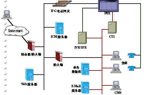 AllCom ICC呼叫中心采用開放的和可擴(kuò)展的體系結(jié)構(gòu),通過高度靈活的系統(tǒng)平臺,為客戶提供Internet多媒體的接入方式。圖中右側(cè)是傳統(tǒng)呼叫中心部分,左側(cè)為Internet呼叫中心所特有的,其中關(guān)鍵部件為Internet呼叫管理(ICM)和IP電話網(wǎng)關(guān)(ITG)。
