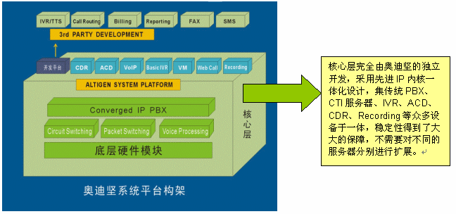 值得一提的是,在穩(wěn)定性上,奧迪堅(jiān)IP一體化呼叫中心平臺(tái)系統(tǒng)構(gòu)架,從產(chǎn)品設(shè)計(jì)之初就突破了以住基于交換機(jī)或板卡的傳統(tǒng)模式,在一臺(tái)通訊服務(wù)器上高度融合了呼叫中心的所有常用功能,有效避免了復(fù)雜的網(wǎng)絡(luò)連接和眾多的各類交換機(jī)和外掛設(shè)備,各個(gè)設(shè)備相對獨(dú)立兼容性差所給呼叫中心系統(tǒng)所帶的穩(wěn)定性欠佳的隱患。除此之外,奧迪堅(jiān)呼叫中心系統(tǒng)底層硬件模塊是在美國設(shè)計(jì)生產(chǎn)的,通過北美和中國的嚴(yán)格的電信入網(wǎng)測試;相對于硬件,平臺(tái)軟件也都是由奧迪堅(jiān)自主開發(fā)設(shè)計(jì)的,針對不同的硬件采用不同的驅(qū)動(dòng)模塊,軟硬一體在交換層又使用統(tǒng)一的邏輯接口,結(jié)構(gòu)清晰,層次合理,不僅保障了穩(wěn)定而且便于擴(kuò)展(如下圖所示),整個(gè)系統(tǒng)作為一個(gè)整體統(tǒng)一擴(kuò)展,不需要對不同的服務(wù)器分別進(jìn)行擴(kuò)展,有效避免了傳統(tǒng)呼叫中心構(gòu)建方式在擴(kuò)展方面存在的復(fù)雜性問題以及高額的擴(kuò)展費(fèi)用。