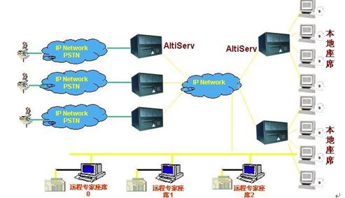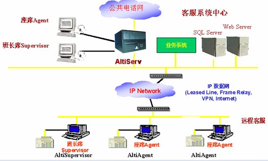 這種組合節(jié)省管理成本,因為所有的座席員都在一點,便于管理控制,同時用戶只要撥打本地電話即可進入系統(tǒng)接收服務(wù),如需人工座席應答的話系統(tǒng)會自動將來電通過Internet轉(zhuǎn)接到座席員處,對公司的話費成本也較低(都是通過Internet實現(xiàn)的長途轉(zhuǎn)接功能)。同時AltiGen也支持通過IP分機的方式遠程登錄到系統(tǒng)實現(xiàn)遠程座席的功能,這樣對有些高級話務(wù)員或?qū)<易,不必每天到公司上班,可以通過家里的電腦登錄到AltiGen系統(tǒng),作為系統(tǒng)的一個分機來完成所有的座席員的功能,在他的電腦屏幕上也能彈出來電人的信息。系統(tǒng)的組網(wǎng)圖如下: