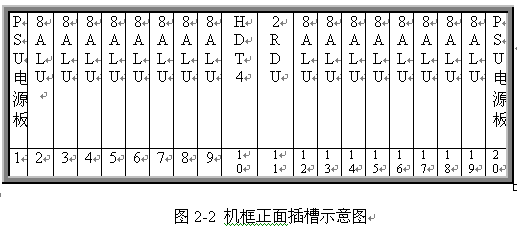 見(jiàn)圖 2 和 3 ,遠(yuǎn)端模塊采用 19 英寸標(biāo)準(zhǔn)機(jī)框,高度為 5U ,可安裝在各種標(biāo)準(zhǔn)的 19 英寸的機(jī)柜中。機(jī)框共 20 個(gè)插槽,正面插板,反面背板出線。每個(gè)機(jī)框可插 20 塊各種類型的板件,其中兩邊第 1 第 20 槽固定插電源板 PSU ,中間第 10 號(hào)槽固定插數(shù)字中繼接口板 HDT4 ,其余 16 個(gè)槽為通用槽口,可插 16 塊各種類型接口板。每塊板為 8 路,一個(gè)機(jī)框總共 128 話路。調(diào)度接口板 2RDU 固定插第 11 槽,該板不占機(jī)框端口。對(duì)于自帶交換系統(tǒng),需要安裝一塊系統(tǒng)信號(hào)音板 8TDU ,該板固定插 19 槽,占 8 個(gè)端口。