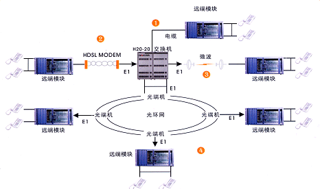 遠(yuǎn)端模塊通過(guò)標(biāo)準(zhǔn) 2M ( E1 )接口與交換機(jī)連接。該接口不受傳輸距離和傳輸設(shè)備的限制。常用的傳輸設(shè)備有 SDH 、 PDH 光端機(jī)(光纜),數(shù)字微波、數(shù)字?jǐn)U頻, HDSL 調(diào)制解調(diào)器(雙絞線)等。