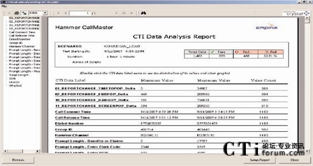 如果響應(yīng)時(shí)間超過設(shè)定的預(yù)置值(閥值),或者發(fā)現(xiàn)任何其它問題時(shí),Hammer可以把這個(gè)錯(cuò)誤和它的位置記錄在數(shù)據(jù)庫中,然后實(shí)時(shí)顯示測試結(jié)果。Hammer可以模擬呼叫流程中的任何一個(gè)方面,包括DTMF按鍵音可變信息的記錄或者是為測試支持語音識別系統(tǒng)而播放大量的語音文件。Hammer專利的語音提示識別能力更可以自動(dòng)檢驗(yàn)在IVR和ACD/PBX系統(tǒng)中是否正確播放語音提示。