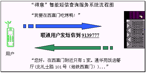 2004年4月15日和4月20日,擁有完全自主知識(shí)產(chǎn)權(quán)的語音與語言技術(shù)開發(fā)商和技術(shù)提供商北京得意音通技術(shù)有限責(zé)任公司(得意公司),在國(guó)際上率先把中文自然語言理解技術(shù)應(yīng)用在中國(guó)聯(lián)通和中國(guó)移動(dòng)短信服務(wù)平臺(tái)上,結(jié)合《精品購物指南》報(bào)社權(quán)威、全面的信息資源,開通了北京地區(qū)餐飲領(lǐng)域智能短信查詢服務(wù)(簡(jiǎn)稱智能短信),并將進(jìn)一步支持互聯(lián)網(wǎng)平臺(tái)和WAP平臺(tái),陸續(xù)開通更豐富和更實(shí)用的智能信息服務(wù)。