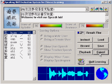 "得意"口語(yǔ)學(xué)習(xí)系統(tǒng)的原理是基于語(yǔ)音音素及其他參數(shù)的提取與分割,將使用者的語(yǔ)音音素系列與標(biāo)準(zhǔn)模型的語(yǔ)音音素序列進(jìn)行自動(dòng)比對(duì),并將比對(duì)結(jié)果通過(guò)視圖形象而直觀地給出,從而對(duì)學(xué)習(xí)者的語(yǔ)音給出恰當(dāng)?shù)脑u(píng)價(jià)(比如對(duì)每個(gè)音素給出一個(gè)得分等),以幫助其改進(jìn)和提高口語(yǔ)發(fā)音,使其接近或達(dá)到語(yǔ)音的標(biāo)準(zhǔn)水平。由于利用可視化的朗讀評(píng)分等人機(jī)交互的方式,而且通過(guò)視覺(jué)、聽(tīng)覺(jué)等綜合手段,反復(fù)提示和幫助用戶接近標(biāo)準(zhǔn)發(fā)音,因而顯著提高了學(xué)習(xí)者的學(xué)習(xí)興趣,這對(duì)提高英語(yǔ)學(xué)習(xí)成績(jī)有很多幫助。