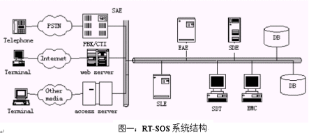 SAE完成接入服務(wù)器(Access Server)和RT-SOS后臺(tái)的通訊, 為每種接入方式設(shè)計(jì)接口程序, 實(shí)現(xiàn)了RT-SOS后臺(tái)業(yè)務(wù)處理與前臺(tái)接入方式無關(guān)。這里的接入服務(wù)器指網(wǎng)站服務(wù)器(IIS、Apache)、短信中心(SMS或者短信網(wǎng)關(guān))、程控交換機(jī)(或者CTI設(shè)備)等等。