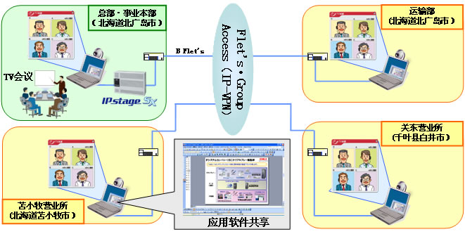 此次開始投入運(yùn)行的IP電話系統(tǒng),在其總部導(dǎo)入了“IPstage SX”,通過沖電氣的“Com@WILL軟電話”具有的TV會議功能,能將包括總部在內(nèi)的北海道3個事業(yè)所與關(guān)東營業(yè)所進(jìn)行電話聯(lián)網(wǎng)。各個事業(yè)所之間通過NTT東日本的IP-VPN服務(wù)“Flet's・Group”實(shí)現(xiàn)相互連接。