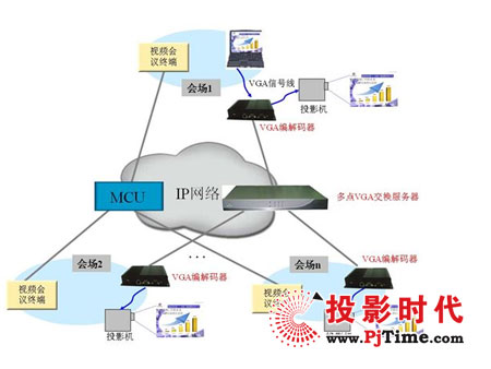 圖如上圖所示,在視頻會議系統(tǒng)帶外硬雙流解決方案中,在每個會場配置VGA編解碼器一臺,在網(wǎng)絡(luò)核心配置多點VGA交換服務(wù)器一臺。需要發(fā)送雙流的會場可將筆記本的VGA輸出信號接入VGA編解碼器的VGA輸入,經(jīng)編碼后通過IP網(wǎng)絡(luò)發(fā)送到多點VGA交換服務(wù)器,多點VGA交換服務(wù)器即可將雙流信號轉(zhuǎn)發(fā)給需要接收雙流的多個會場的VGA編解碼器,經(jīng)解碼后輸出到投影機等設(shè)備顯示,從而在視頻會議中實現(xiàn)雙流功能。在本方案中,雙流的切換控制通過多點VGA交換服務(wù)器進(jìn)行,會議管理員可以通過IE瀏覽器登錄該服務(wù)器,建議一個“會議”,呼入各會場的VGA編解碼器,并根據(jù)會議需要切換廣播其中一個VGA編解碼器采集的“雙流”信號給其它的VGA編解碼器,從而實現(xiàn)雙流在會場間的切換控制。VGA編解碼器具有自動信號偵測功能,可檢測本編解碼器是否接有有效的VGA信號輸入并告知多點VGA交換服務(wù)器,可有效避免會議管理員廣播“空”的雙流信號。