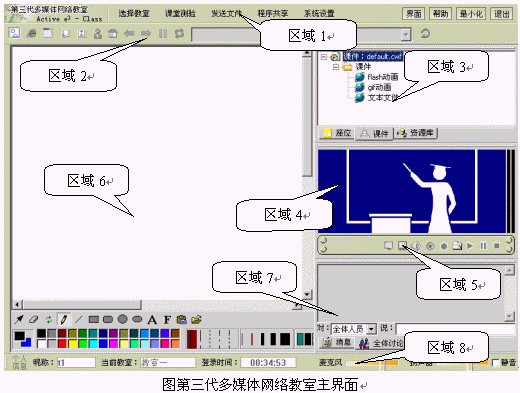 如圖所示,第三代多媒體網(wǎng)絡(luò)教室主界面主要包括以下幾個區(qū)域: