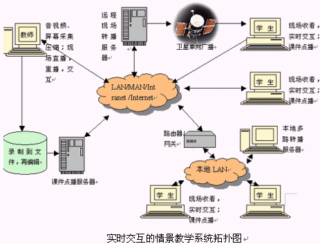 實時交互的情景教學系統(tǒng)是一整套提供實時的遠程教學服務(wù)的系統(tǒng)軟件,它采用音視頻交互系統(tǒng)、文件共享交互系統(tǒng)、電子白板、BBS系統(tǒng)等多種系統(tǒng)的整合,為教師與學生提供了方便、適用交流工具。實時交互的情景教學系統(tǒng)不僅是先進的計算機科學和技術(shù)體現(xiàn),更重要的是能夠為遠程教育提供一個符合信息化教育規(guī)律,真正高效的現(xiàn)代化教學手段。