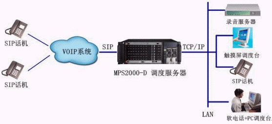 由于MPS2000-D調(diào)度系統(tǒng)本身具有具大的軟交換功能,所以調(diào)度系統(tǒng)既可以與企業(yè)已建成的VOIP系統(tǒng)相連,對VOIP管理的終端進(jìn)行調(diào)度,又可以對自己管理的用戶進(jìn)行調(diào)度。系統(tǒng)豐富的資源使其除了具有基本調(diào)度功能外,還具有強(qiáng)大的會議功能,可以實(shí)現(xiàn)從3方到幾十、幾百方的全交互會議;還可對調(diào)度過程自動進(jìn)行錄音備份;使每個分機(jī)都具有語音信箱功能;TTS資源的引入,可將文本文件變成語音,使所有調(diào)度成員可以聽文件;ASR資源的引入,改變了以往通過按鍵撥號進(jìn)行調(diào)度的形式,可直接通過語音呼叫進(jìn)行調(diào)度,使調(diào)度變得更方便、更快捷。