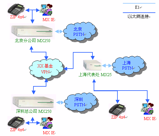利用現(xiàn)有的VPN網(wǎng)絡連接深圳總公司和北京分公司的兩臺MX250媒體交換機,上海辦事處配備一臺MX25網(wǎng)關(guān),MX250、MX25與當?shù)氐碾娫捑W(wǎng)連接。深圳總公司、北京分公司和上海辦事處配備一定數(shù)量的SIP話機,員工電腦安裝MXIE軟件。