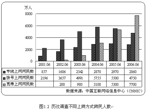 其中專線上網(wǎng)網(wǎng)民人數(shù)為2860萬(wàn)人,與去年同期相比減少了110萬(wàn)人,同比下降3.7%;撥號(hào)上網(wǎng)網(wǎng)民人數(shù)為4750萬(wàn)人,與去年同期相比減少750萬(wàn)人,同比下降13.6%;寬帶上網(wǎng)網(wǎng)民人數(shù)為7700萬(wàn)人,與去年同期相比增加了2400萬(wàn)人,增長(zhǎng)率為45.3%(如圖5.2所示)。從調(diào)查結(jié)果可以看出,在網(wǎng)民總數(shù)保持增長(zhǎng)的情況下,使用不同方式上網(wǎng)的網(wǎng)民人數(shù)卻有增有減。隨著中國(guó)網(wǎng)絡(luò)發(fā)展的整體走勢(shì)變化,使用專線及撥號(hào)上網(wǎng)的網(wǎng)民人數(shù)有所減少,而使用寬帶上網(wǎng)的網(wǎng)民人數(shù)保持高速增長(zhǎng)。