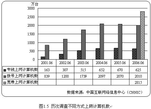 其中專線上網(wǎng)計(jì)算機(jī)數(shù)為625萬(wàn)臺(tái),與去年同期相比減少了45萬(wàn)臺(tái),同比下降6.7%;撥號(hào)上網(wǎng)計(jì)算機(jī)數(shù)為2010萬(wàn)臺(tái),與去年同期相比減少了60萬(wàn)臺(tái),同比下降2.9%。本次調(diào)查結(jié)果顯示,寬帶上網(wǎng)計(jì)算機(jī)數(shù)為2815萬(wàn)臺(tái),在我們所調(diào)查的不同方式上網(wǎng)計(jì)算機(jī)數(shù)中所占比例最高(如圖5.5所示)。通過(guò)調(diào)查結(jié)果可見,雖然上網(wǎng)計(jì)算機(jī)總數(shù)保持增長(zhǎng),但專線上網(wǎng)計(jì)算機(jī)數(shù)、撥號(hào)上網(wǎng)計(jì)算機(jī)數(shù)仍然為負(fù)增長(zhǎng),而寬帶上網(wǎng)計(jì)算機(jī)數(shù)增長(zhǎng)迅速。