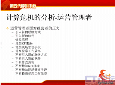 計算危機的下一方面是運營管理者,可能在座很多人是做運營管理的,你們會不斷去跟IT服務者提需求,我下一個月想引進新的聯絡方式,下個月我想引進新的軟件,引進新的流程,我想增加KPI指標,我想增加現場的管理手段,我想提高座席的工作效率,后面也是不斷的,不斷地去引入新的聯絡方式。
