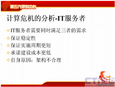 我分析一下計算的危機,計算危機來源于三個方面,第一是客戶面對不斷提升的服務水平,現在需要新的通信方式,包括電話、傳真、短信、電子郵件等等,還包括網上的護航瀏覽,表單共享,電子排版等等通信方式。第二方面需要更快的服務時間,80%的電話是20秒接起,可是短信的響應時間為什么這么長,需要更準確的服務,電話的服務是什么樣的,我現在需要網上交談的服務質量也能夠得到保障等等,這是客戶對IT服務者提供的壓力。