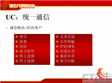 那么這幾個特點稍微簡單地說一下,可能大家了解比較多了,從UC上來講,不管是現在國際上比較領先的通信廠商,CISCO、華為都在提UC的概念,軟件行業(yè)包括微軟。UC包括了通信的渠道,包括電話、傳真、短信、電子郵件、網上音頻、視頻,文本交談,文件傳輸、護航瀏覽、應用共享、桌面共享等等,這是統(tǒng)一通信的部分。