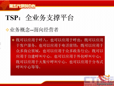 TSP這個概念其實比較清晰,比較簡單,它的意思就說對于呼叫中心來說,它能支持各種業(yè)務,既可以支持呼入,也可以支持呼出;既可以應用于客戶服務,也可以應用于電話營銷;既可以應用于商業(yè)領域,也可以應用于政務領域;既可以用于自建,也可以用于外包;可以是大規(guī)模集中的,也可以是分布式的。