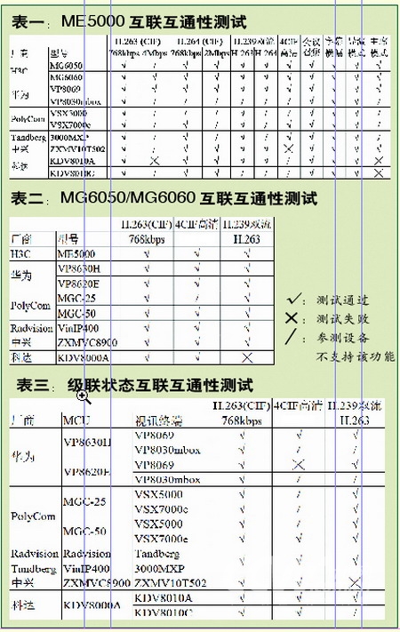 上述3組測試表明,ME5000和MG6050/MG6060能夠與參測的所有產(chǎn)品互聯(lián)互通,并保證絕大部分主流應(yīng)用的正常運(yùn)行,這充分肯定了研發(fā)部門所做的工作。其實,在第二組測試中,我們將MG6050/MG6060交由其他MCU管理的同時,也加入了所有視訊終端,以便測試這些廠商之間的互聯(lián)互通性。但測試結(jié)果非常不理想,有些甚至無法正常連接。由于缺少這些廠商工程師的支援,我們無法定論它們之間的兼容性問題,但能夠確定的是,前文所提及的H.239雙視頻流傳送、H.264視頻編解碼以及4CIF高清規(guī)格視頻3個特性確實是影響互聯(lián)互通性的關(guān)鍵,廠商如果想改善這個現(xiàn)狀,進(jìn)行針對性研發(fā)是必需的。