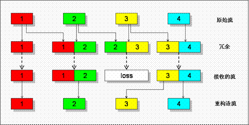 當?shù)?個包在傳輸過程中丟失時,由于包“3”被冗余編碼到第4個傳輸包中,在對端接收到碼流后還可以正常重構出包“3”。