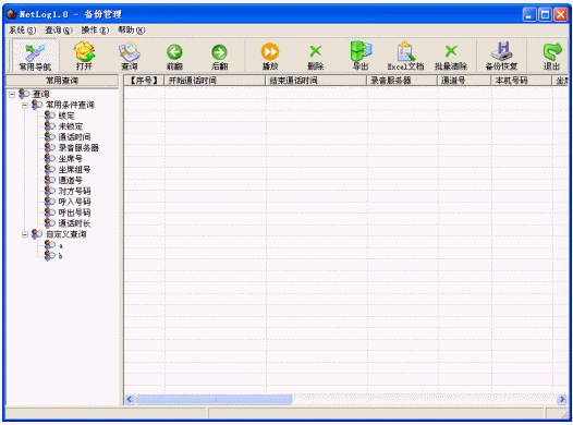 針對(duì)備份語(yǔ)音記錄文件(包括DVD光盤(pán)備份和磁盤(pán)備份)查詢、管理功能,查詢過(guò)程以及錄音操作與錄音管理功能模塊完全相同,此外還提供了恢復(fù)的功能。