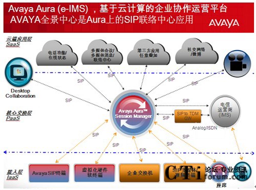 - 當(dāng)其他廠商還在爭論公有云和私有云的優(yōu)劣時,Avaya已經(jīng)開始部署企業(yè)的私有云—Avaya Aura 和運(yùn)營商的公有云之間如何和諧共處;企業(yè)用戶的統(tǒng)一通信功能完全基于”按需服務(wù)激活”模式;