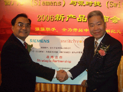 2006年3月29日的北京,還有些春風(fēng)料峭,但北京長富宮的芙蓉廳卻是暖意融融,德國通訊業(yè)巨擘西門子(Siemens)和美國企業(yè)通訊業(yè)新寵訊時捷(Switchvox)聯(lián)合舉辦VoIP新產(chǎn)品發(fā)布會,西門子終端通訊設(shè)備(上海)有限公司CEO