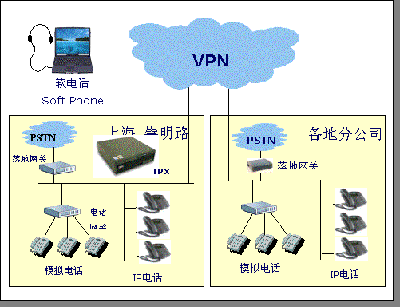 虛擬辦事處/分公司: 企業(yè)沒(méi)有常駐辦公機(jī)構(gòu)的地區(qū),可以通過(guò) IPX 系統(tǒng)將用戶(hù)的電話咨詢(xún)通過(guò) INTERNET 傳輸?shù)娇偛刻幚。?dāng)?shù)卦O(shè)置一套網(wǎng)絡(luò)電話終端