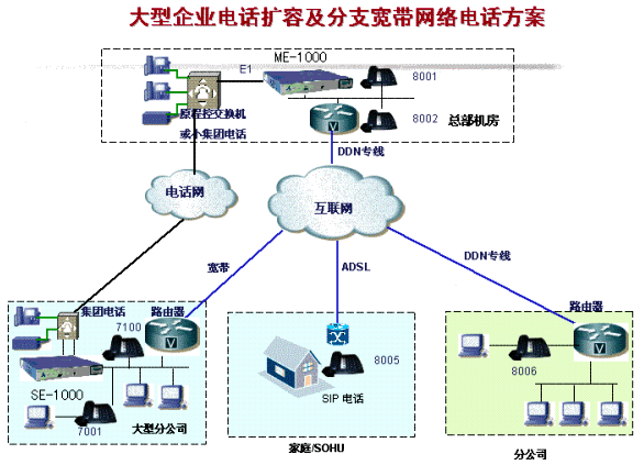 部署一臺(tái)Simplicity™ SE-1000,與原PBX連接,并通過(guò)IP網(wǎng)絡(luò)與總部的Simplicity™