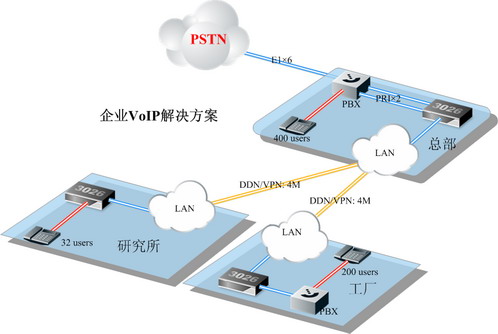 而目前網(wǎng)絡環(huán)境的改善,ADSL、寬帶的接入方式越來越普及,許多企業(yè)以及他們的分支機構(gòu)已經(jīng)通過各種方式接入Internet,鑒于Internet便宜的使用費用,廣泛的普及范圍,基于VPN/DDN的VOIP解決方案,徹底解決了上述問題,彌補了傳統(tǒng)電話網(wǎng)關(guān)的不足,且用戶可以根據(jù)自己需要,不斷擴展IP語音端口,"邊發(fā)展邊升級",經(jīng)濟靈活,是一套性價比非常高的方案。