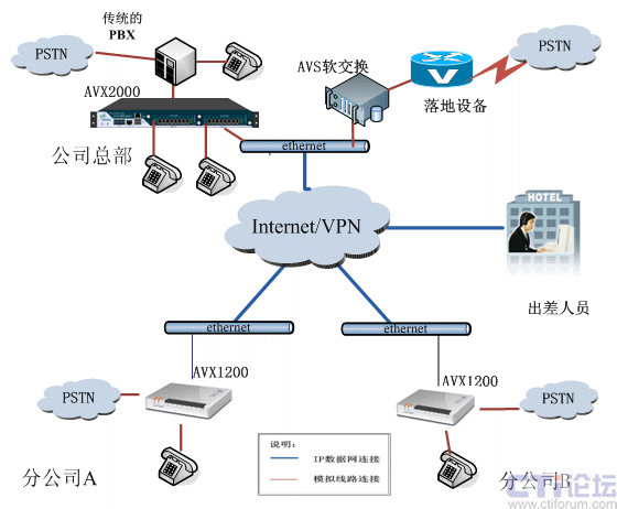 如圖所示:公司總部使用傲威通信的AVX2000注冊到AVS軟交換網(wǎng)絡,分機電話可以通過網(wǎng)絡撥打VoIP出局,同時也可以通過O口實現(xiàn)網(wǎng)絡備用出局和PSTN撥入總機。