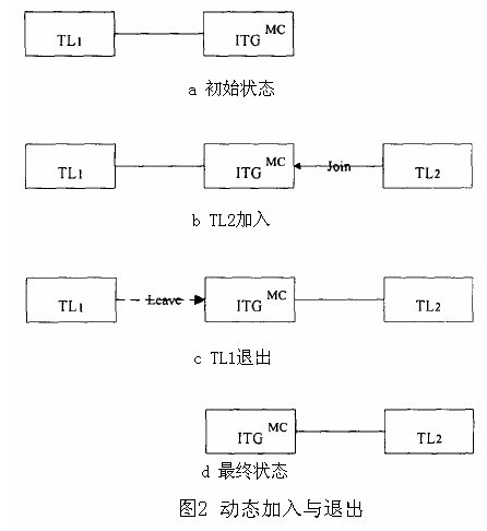 首先,點(diǎn)到點(diǎn)的會議首先是建立在ITG與TL1間的。TL2之后再加入會議中無論是通過邀請還是它自己通過ITG中MC的申請。ITG與TL2間新的連接在TL2加入時(shí)建立。最后,TL1在TL2加入后退出會議。這樣ITG與TL1間連接的中斷將不會影響ITG與TL2的連接。這也說明了移動(dòng)網(wǎng)絡(luò)電話的移交處理與ad hoc多點(diǎn)會議的動(dòng)態(tài)加入與退出是等價(jià)的。圖3(a)說明了ITG與TL1通信時(shí)的漫游。圖2(b)說明了子網(wǎng)1向子網(wǎng)2的移交處理。圖2(c)說明了在移交處理結(jié)束后ITG與TL1連接的中斷。最后,移交處理成功完成,只剩下ITG與TL2的連接,如圖2(d)所示。