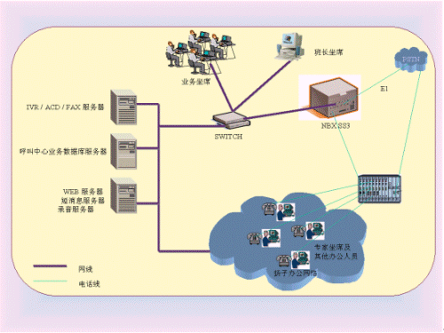 方式的解決方案。一期工程要開通一條E1接入,8個人工坐席;并且整個呼叫中心要與現(xiàn)有辦公電話網(wǎng)絡無縫銜接,與報社采編、出版等業(yè)務要相互掛鉤。