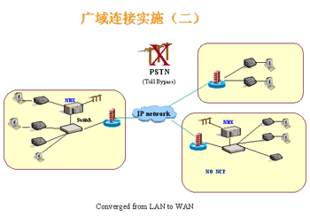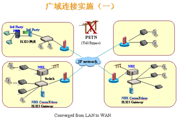 一些企業(yè)目前已經(jīng)擁有PBX系統(tǒng),如何既利用現(xiàn)有PBX,同時又可以發(fā)揮NBX的優(yōu)勢。這是需要通過WAN網(wǎng)進(jìn)行語音通信的企業(yè)經(jīng)常遇到的問題。解決的方案是:
