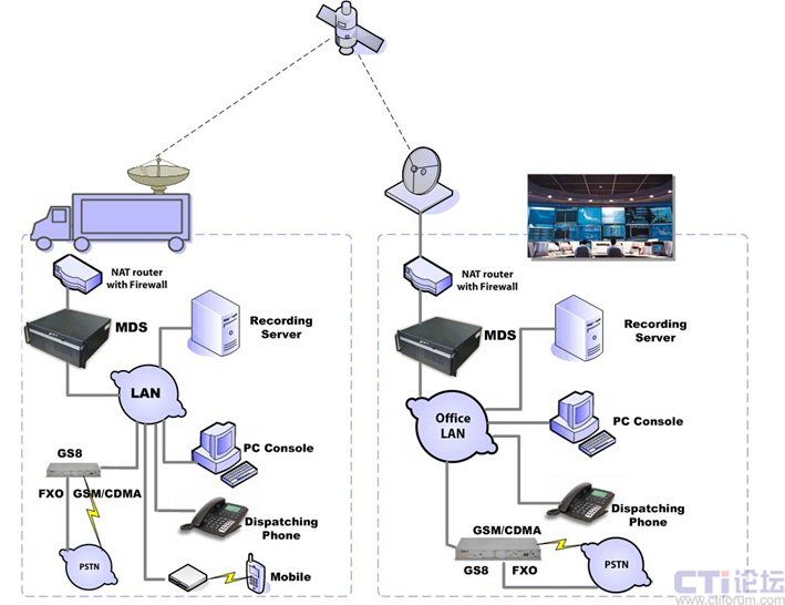 Zed-3的車載調(diào)度系統(tǒng)支持多種接口,通過無線網(wǎng)關(guān)提供的GSM、CDMA或模擬中繼端口,可以實(shí)現(xiàn)與固定電話、手機(jī)等外部電話的互通。即使在現(xiàn)場沒有任何可用的外線資源,例如沒有模擬電話接口,手機(jī)卡沒有信號,也仍然可以通過衛(wèi)星鏈路將呼叫連接到指揮中心的網(wǎng)關(guān)設(shè)備再落地,最大可能的保證現(xiàn)場調(diào)度系統(tǒng)與外部電話的通信。