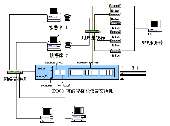 綜合接警平臺(tái)主要由hxd09可編程智能語音交換機(jī)和計(jì)算機(jī)網(wǎng)絡(luò)兩部分組成,交換機(jī)負(fù)責(zé)110、119、122報(bào)警電話的接入與分流及調(diào)度呼出等功能;計(jì)算機(jī)網(wǎng)絡(luò)則完成110、119、122報(bào)警信息的顯示、數(shù)據(jù)儲(chǔ)存、統(tǒng)計(jì)及信息查詢、發(fā)布功能。