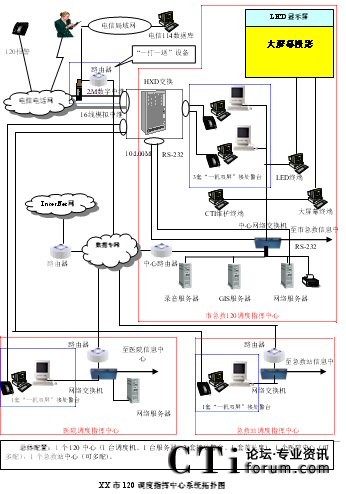 - 樹立大網(wǎng)絡概念:采用先進的通訊、計算機網(wǎng)絡技術(shù)(如CTI技術(shù)),利用現(xiàn)有的通信資源,實現(xiàn)市人民醫(yī)院120指揮中心與急救分站的計算機網(wǎng)絡及相關領導辦公室計算機大聯(lián)網(wǎng);形成全市范圍內(nèi)120有線、無線全方位立體調(diào)度語音通道大網(wǎng);為今后督查聯(lián)網(wǎng)、大聯(lián)動打下基礎。