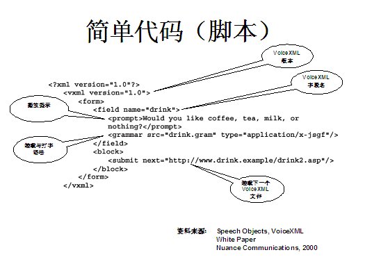 VoiceXML與多通道應(yīng)用,目前應(yīng)用正在逐步擴(kuò)大 - 電信運(yùn)營(yíng)商DoCoMo與SprintPCS等將其應(yīng)用于增值服務(wù),以增加自己的收入,旅游巨頭美聯(lián)航等將它用于旅游信息服務(wù),通用電氣等企業(yè)將它用于允許公司用戶訪問(wèn)公司的數(shù)據(jù)庫(kù)等。