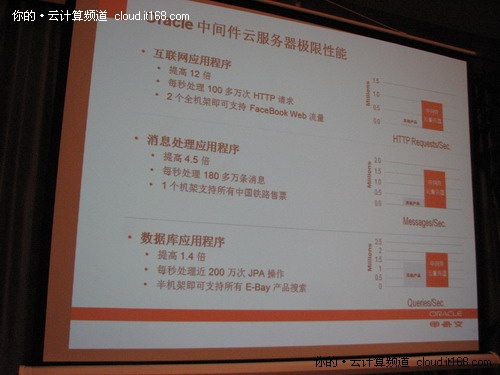 在溝通會(huì)上,喻思成用數(shù)字來(lái)告訴媒體Oracle中間件云服務(wù)器的Java應(yīng)用性能和可靠性在甲骨文進(jìn)行的內(nèi)部測(cè)試中,單機(jī)架Oracle Exalogic Elastic Cloud顯示: 互聯(lián)網(wǎng)應(yīng)用性能提高12倍,達(dá)到每秒100萬(wàn)HTTP以上;消息處理應(yīng)用性能提高4.5倍,每秒能處理超過180萬(wàn)條消息。