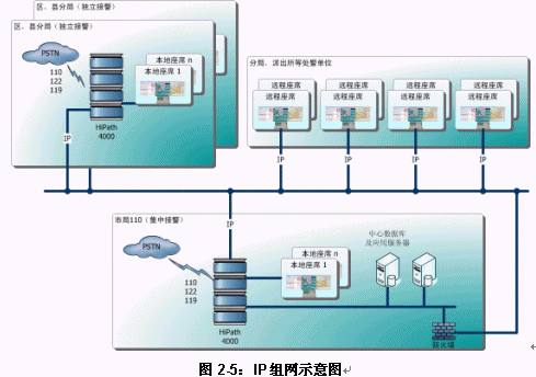 圖 2-5給出了使用純IP實(shí)施城市110組網(wǎng)的最普遍的示意。從該圖可以看出,無論采用集中接警還是分散處警,C&CC特別使用于使用純IP技術(shù)實(shí)施全市(包括所轄縣級(jí)市)110組網(wǎng)。考慮到目前全國(guó)公安二、三、四級(jí)網(wǎng)建設(shè)日漸成熟,使用純IP技術(shù)實(shí)施全市110組網(wǎng)并實(shí)現(xiàn)"三警合一"確實(shí)是經(jīng)濟(jì)、靈活而方便的選擇,前文提到的芬蘭112全國(guó)組網(wǎng)使用的也是這樣的技術(shù)。當(dāng)然,現(xiàn)存的傳統(tǒng)公安通訊專網(wǎng)仍然可以作為備份話務(wù)路由存在。