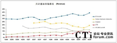 CTI論壇(ctiforum)4月16日消息(記者 潘婷婷): 近日,業(yè)內(nèi)著名調(diào)研公司Infonetics發(fā)布了2009年全球無線通信設(shè)備市場(chǎng)研究報(bào)告《2G/3G Mobile Infrastructure and Subscribers》。根據(jù)報(bào)告顯示,2009年全年,全球無線通信市場(chǎng)份額出現(xiàn)了較大變化,按載頻計(jì),中興通訊全年以12.6%的全球市場(chǎng)份額超越阿爾卡特-朗訊,居行業(yè)第4,按載頻計(jì),2009年全球無線設(shè)備出貨市場(chǎng)份額排名為愛立信、華為、諾基亞-西門子、中興、阿爾卡特-朗訊,分別為28.2%,22.1%,19%,12.6%和9.2%。