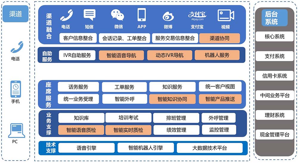 智能鑒權(quán)、智能語音導(dǎo)航、智能路由、智能知識(shí)庫(kù)匹配、智能質(zhì)檢、智能外呼