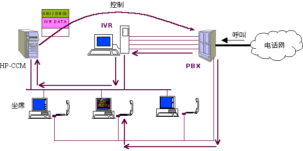 在任何一個步驟中,如客戶選擇了人工坐席,則IVR請求CCM根據(jù)多種情況選擇一個空閑坐席(選擇方法見下文)并控制PBX將呼叫與選擇的人工坐席接通,同時系統(tǒng)在客戶對IVR操作的過程中,已經幀測到了客戶所使用的電話號碼、客戶的按鍵信息,系統(tǒng)還記錄有客戶上次的呼叫情況等數(shù)據(jù),這些數(shù)據(jù)基本上可以確定客戶大體關心的問題,對于老客戶甚至可以初步認定呼叫者的身份、年齡、性別、業(yè)務辦理情況等,因此,話務員在與客戶談話之前就已經了解了相當多的信息,并控制選定的坐席屏幕顯示有關客戶信息,便于直接進入正題,提高了效率?蛻襞c坐席的交流過程中,坐席可通過終端請求CCM控制PBX將本次呼叫與其他話務員(坐席)、專家或業(yè)務辦公室(如內線電話)等接通,當坐席人員將呼叫轉移到另一坐席或專家時,系統(tǒng)將在本呼叫中收集的各類數(shù)據(jù)同時轉向下一坐席電腦。在坐席人員解答客戶問題時,可將問題及解答情況收集,便于分析坐席人員的業(yè)務素質和問題傾向,從而有針對性地培訓坐席人員。對于客戶來講,他可以通過電話按鍵在話務員、自動語音、傳真、專家和業(yè)務辦公室之間漫游,系統(tǒng)將記錄客戶漫游的路徑,對于設計較好的菜單和路經來說,客戶的漫游路徑基本上可以反映出其需求,大量客戶的漫游路徑無疑將反映出市場需求。