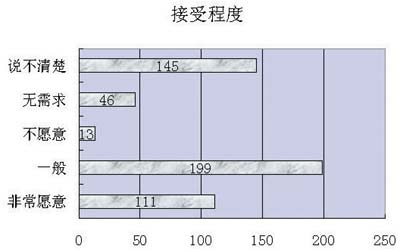 在調(diào)查中,67.4%的用戶對現(xiàn)有中國電信的資費標(biāo)準(zhǔn)(10元/分鐘)表示不滿,32.6%的用戶表示滿意。但同時58%的用戶對能接受的資費標(biāo)準(zhǔn)上又選擇了居中和較高的資費標(biāo)準(zhǔn),表明用戶對視訊應(yīng)用產(chǎn)品的價格承受能力較高。